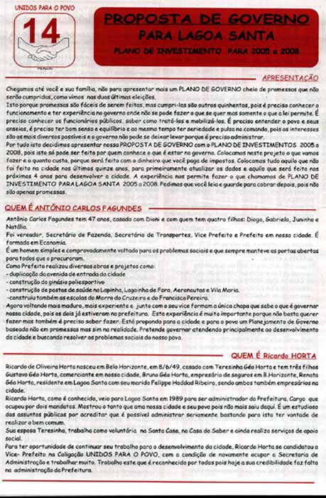período de Eleição e Eventos opera milagres O muro é a forma preferida pelos candidatos para a propaganda eleitoral www.lagoasanta.com.br sempre presente nos momentos importantes da cidade 13-Set-2004 |